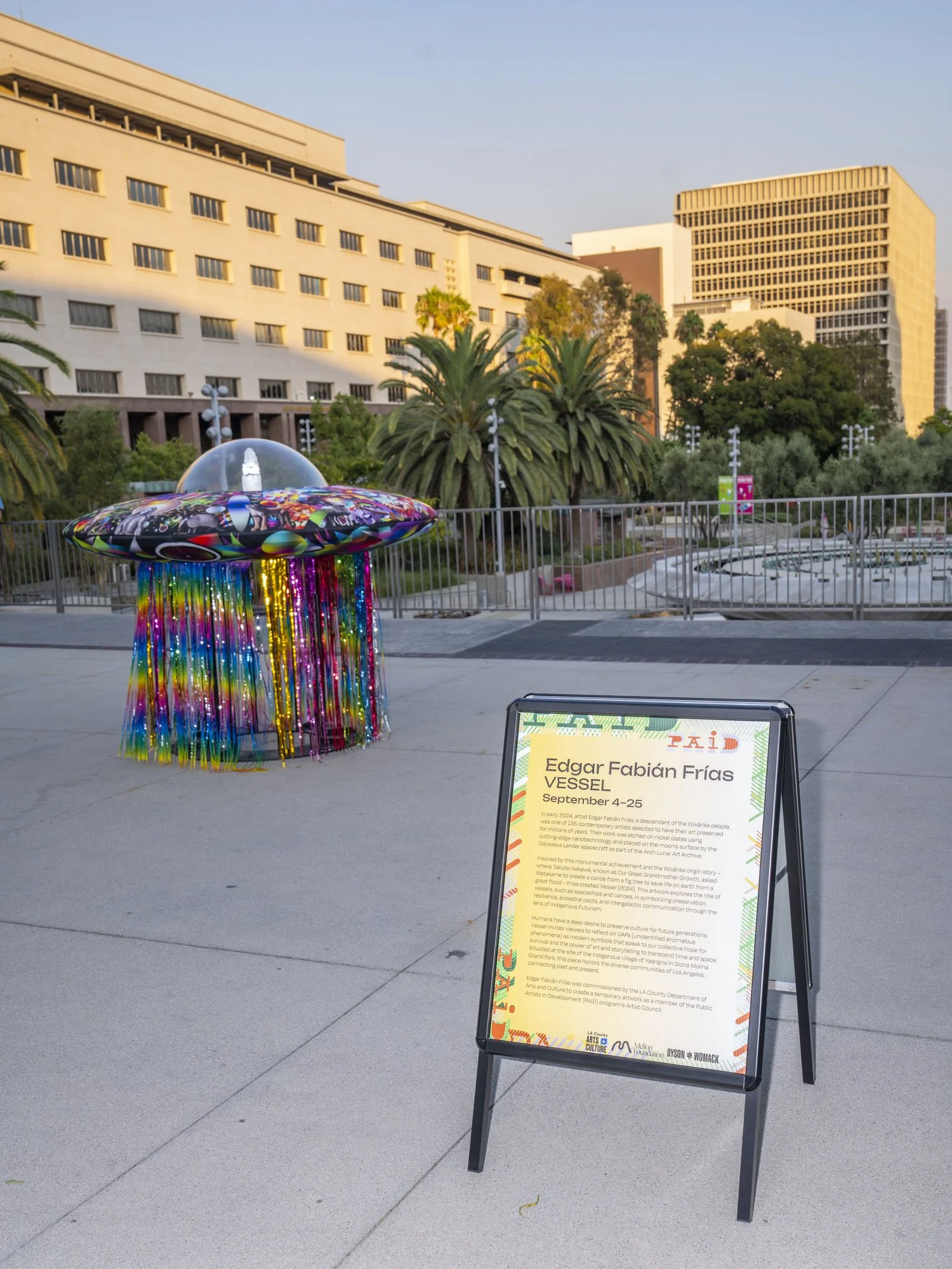 Situated at the historic site of Yaangna in Gloria Molina Grand Park, VESSEL merges technology, storytelling, and community through the lens of Indigenous Futurism. Its surface features drawings, paintings, and images depicting a Wixárika origin story featuring Takutsi Nakawé, who saved life on earth from a great flood by instructing Watakame to build canoe to hold life through the chaos. During the opening activation, I invited participants to share their intentions into a solar-powered selenite crystal embedded within the artwork, transforming VESSEL into an amplifier for dreams and desires. At night, the crystal illuminates, casting an oscillating rainbow that transmits these collective intentions into the cosmos. By engaging with UAPs, stories, and projecting prayers into the universe, VESSEL invites viewers to explore new narratives of survival and hope. Commissioned by the LA County Department of Arts and Culture.