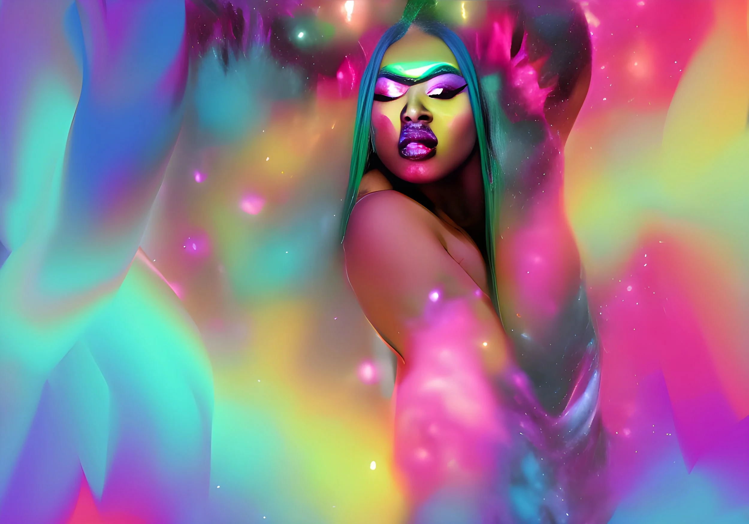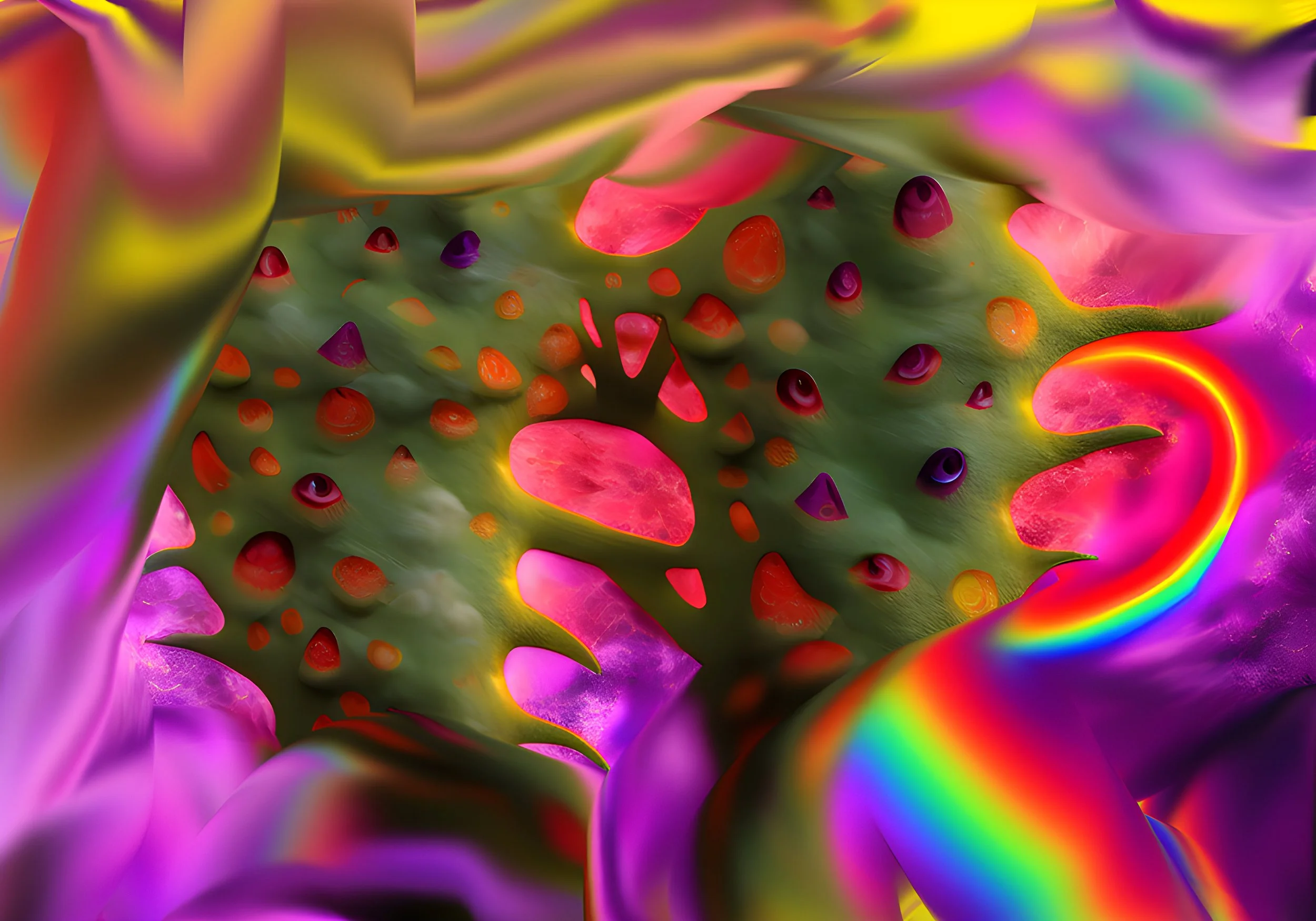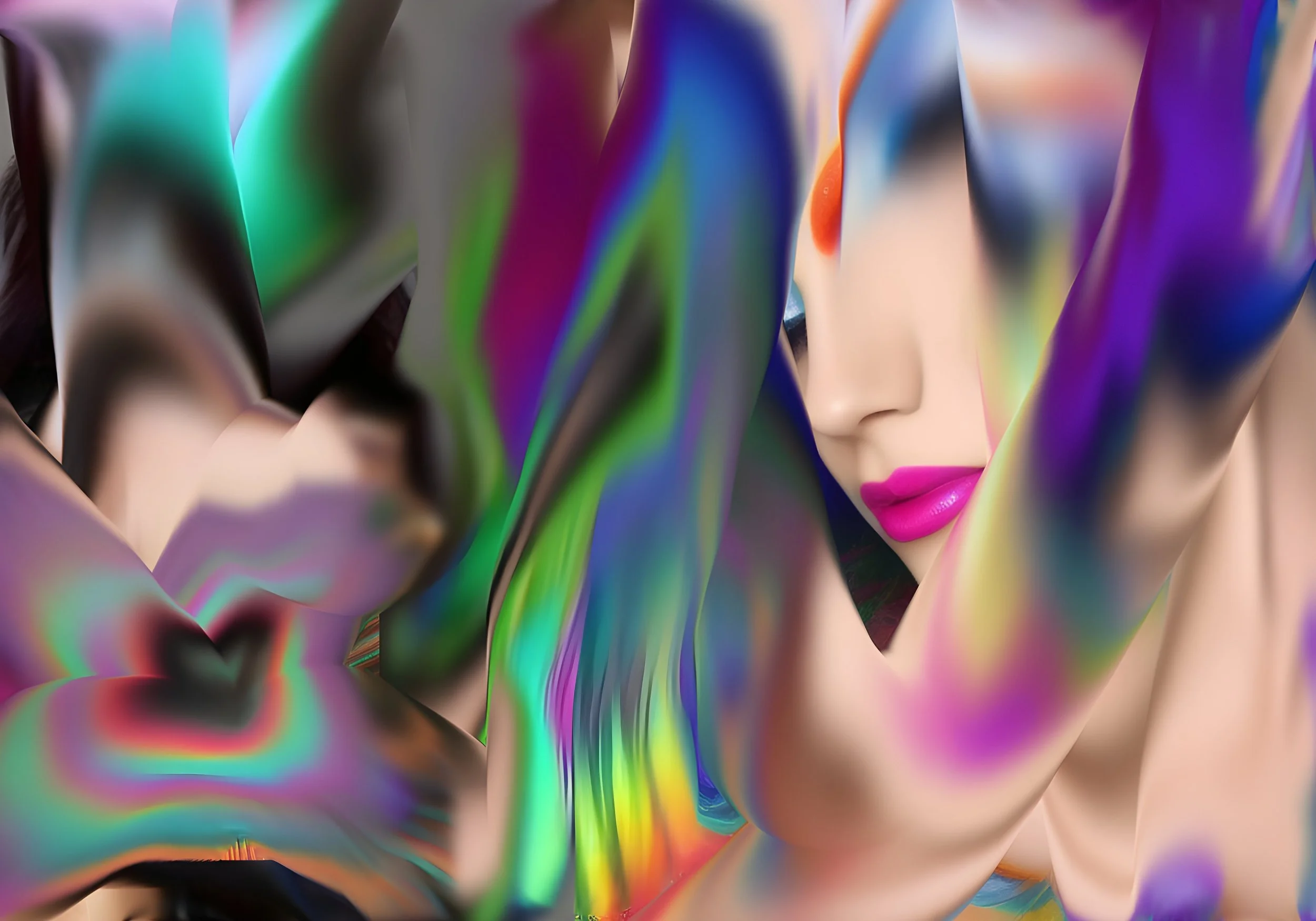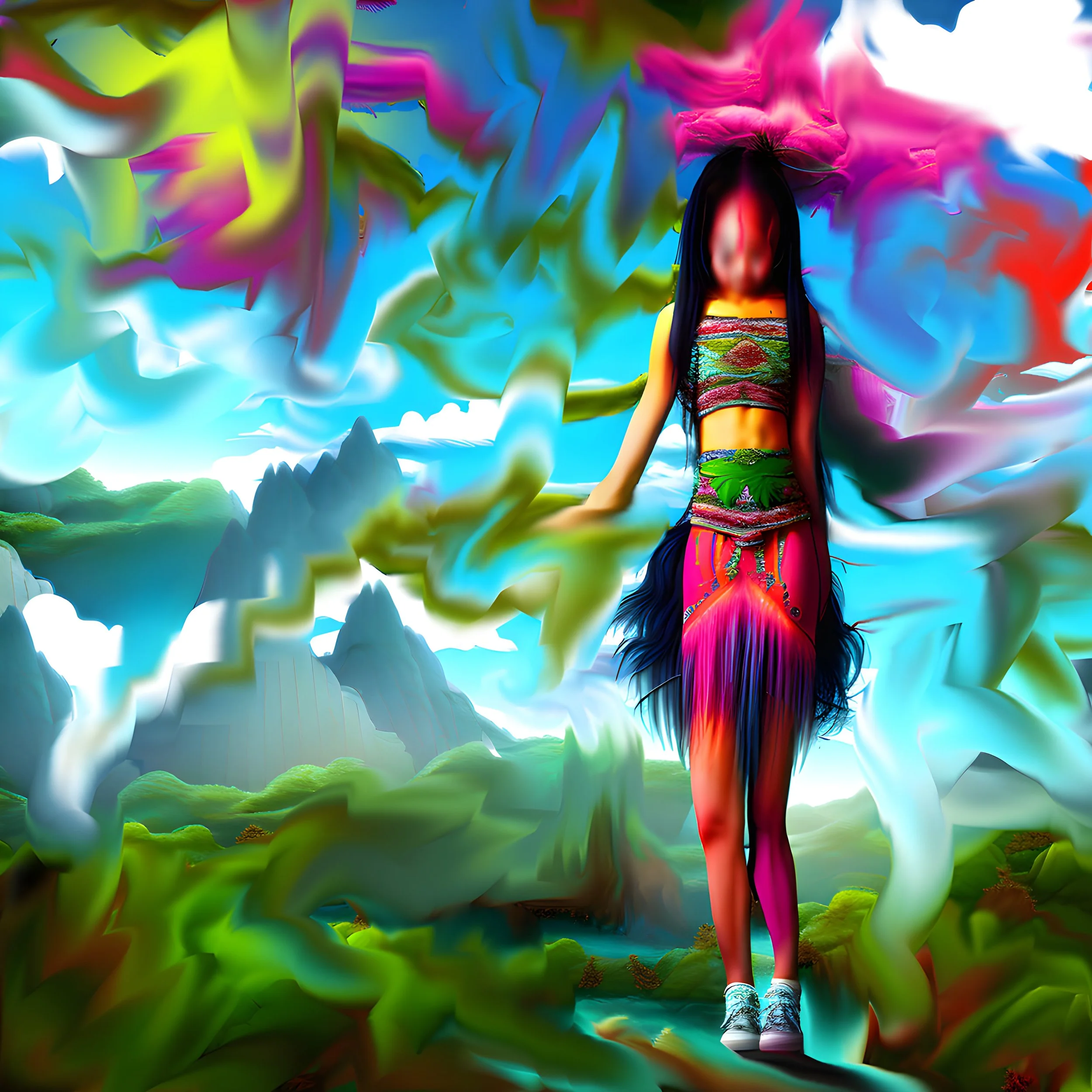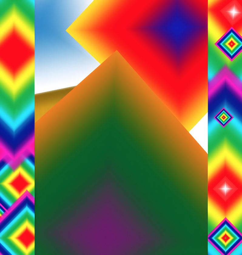 Against these fixed outlines, Wixárika artist and brujx Makuyeika, Edgar Fabian Frias creates virtual, holographic maps that embrace diffusion and fluidity. Unlike Gast’s “American Progress,” the figures in Frias’s works are integrated into the landscape, their colors synthesizing with the environment. These are maps for contemporary ancestors, drawing from “Nierika,” a Wixárika technology for world-making.