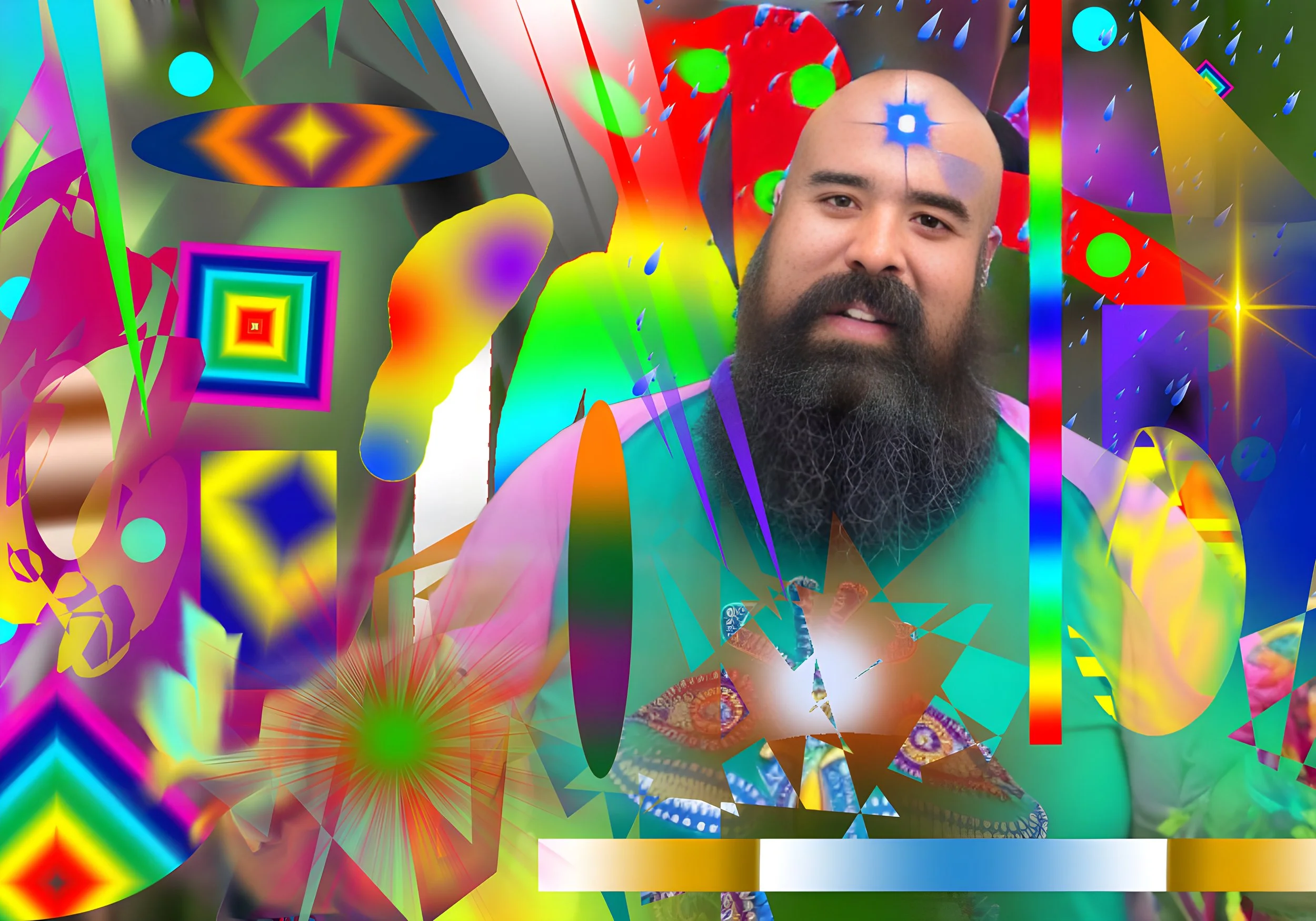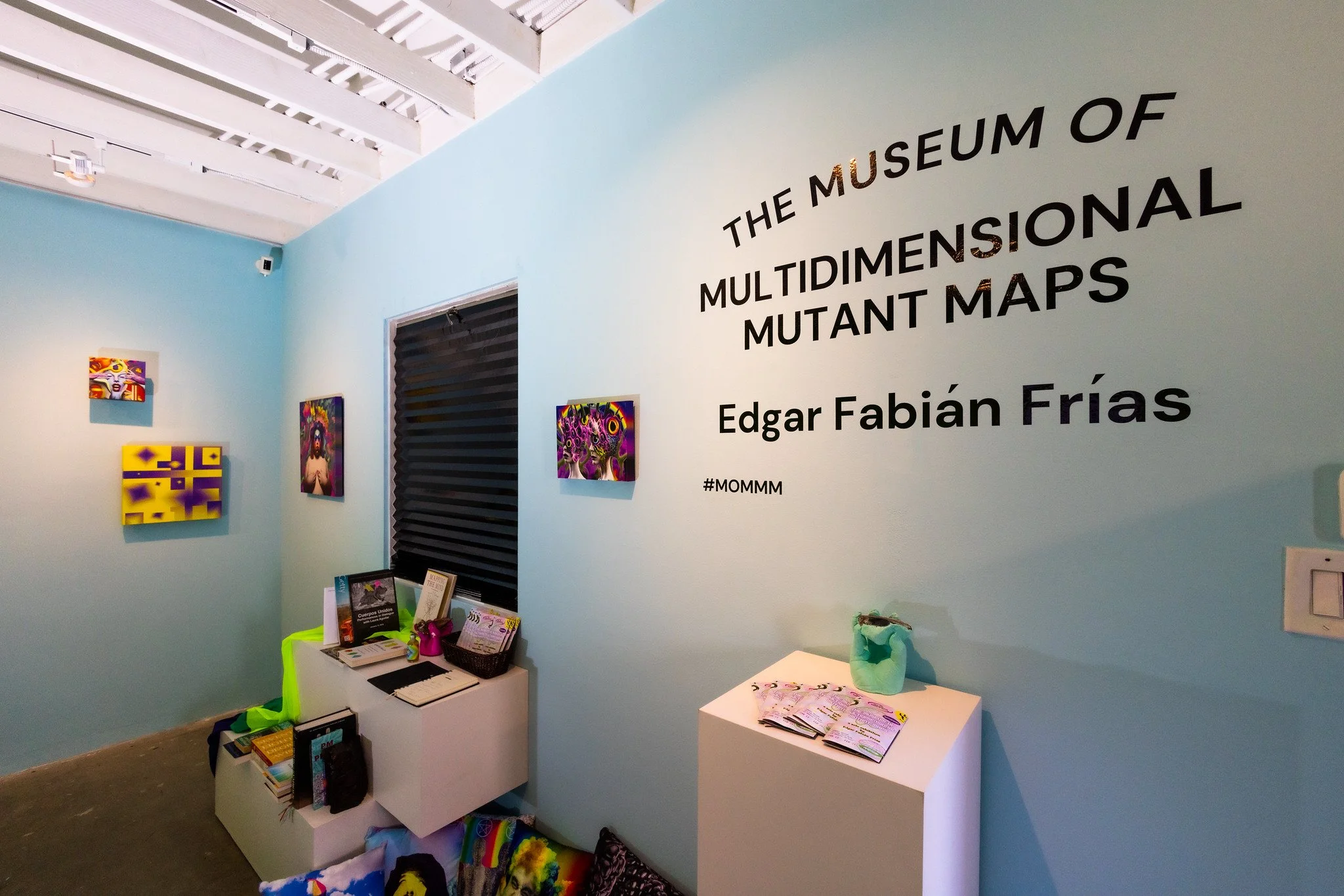“With their irreverent techno-psychedelia, Edgar Fabián Frías challenges the subjective and colonial nature of Western cartography in favor of a more open-ended and expansive map-making system. Drawing inspiration from the Wixárika (Huichol) people's Nierika technique, a traditional craft that incorporates yarn, beads, and other objects to depict symbolic images of flora and fauna, Frías creates paintings, sculptures, videos, and interactive installations that subvert linear portrayals of time and space.”